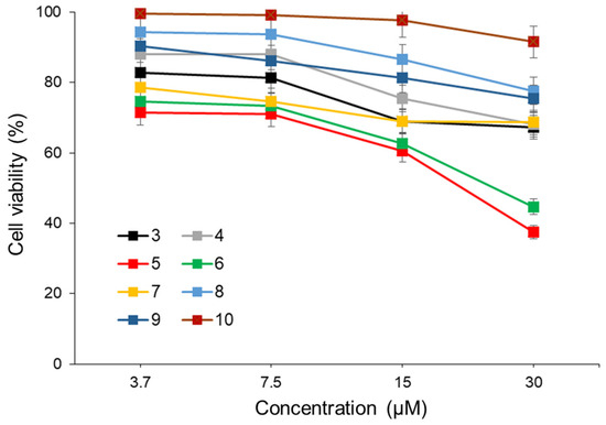 Human colorectal adenocarcinoma Colo205 cells were cultured in RPMI 1640 media with 10% (v/v) heat-inactivated fetal calf serum, penicillin (100 IU/mL), and streptomycin (100 μg/mL) at 37 °C in a 95% air and 5% CO2 atmosphere. In 96-well plates, Colo205 cells were seeded at a density of 1 × 104 cells/well and cultured for 24 h. Compounds 3–10 (0–30 μM) were then added to the culture medium. After 4 h, the plates were exposed to 365 nm LED light irradiation. Following 48 h of incubation, cytotoxicity and cell viability/growth were assessed using 0.5% (w/v) trypan blue exclusion and 10 μL WST-8 assays. The reductions in the fraction of viable cells were determined using the GloMax Multi Detection System (Promega Corp., Madison, WI, USA) to measure absorbance at 450 nm (reference at 600 nm).