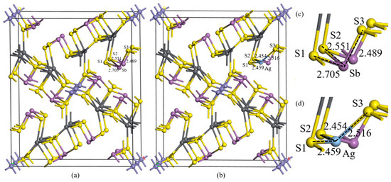 Unit cell structures of Ag vacancy doping. S–pb vacancy doping (a), S–Sb vacancy doping (b), S–pb vacancy doping microstructure (c), and S–Sb vacancy doping microstructure (d).