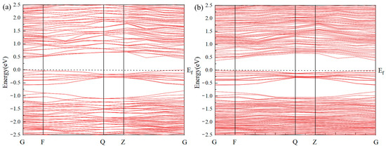 The band structure of pure jamesonite and jamesonite doped with a single Ag atom through S–Sb vacancy doping is shown in Figure 3. This study reveals that the band gap of pure jamesonite is 0.431 eV [30], indicating a clear semiconductor structure. After Ag atom doping, the band gap of jamesonite is reduced to 0.379 eV. The Ag-induced impurity band introduces localized energy levels at 0.10 eV below the conduction band minimum (CBM) and 0.07 eV above the valence band maximum (VBM), narrowing the effective band gap. Additionally, partial overlap between the impurity band and the conduction band 0.05 eV above the Fermi level further reduces the energy barrier for electronic transitions. Overall, Ag doping into jamesonite modifies the band gap and the density of states near the Fermi level, significantly enhancing the electrical conductivity and surface reactivity of Ag-doped jamesonite. This promotes stronger π-backbonding interactions between collector molecules and Ag atoms, aligning with the observed improvements in flotation efficiency.