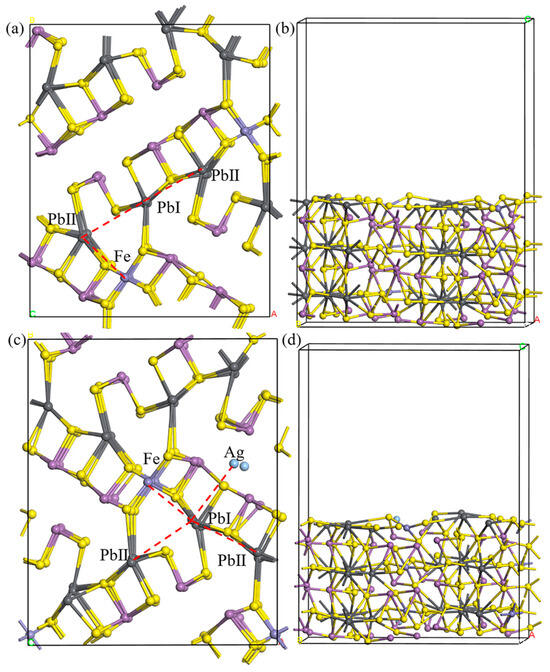 The pure jamesonite (001) surface is shown in Figure 4a. Since the adsorption of collectors on the Pb-exposed surface of jamesonite (001) is the most stable within jamesonite [25], and Ag atoms are present in the channel-doped Pb-exposed surface of jamesonite (001), we chose the Pb-exposed surface of jamesonite as the research object. From Figure 4, it can be seen that the bond between Pb and nearby S atoms is relatively long, indicating a weaker bonding interaction, whereas Fe atoms are connected to S atoms in a covalent bond, indicating a stronger bonding interaction; Sb also forms relatively weak bonds with nearby S atoms, but stronger than the Pb–S bond. During the surface relaxation process, due to atomic deformations, the internal Fe atoms change from dsp2 hybridization (square planar) in the bulk phase to sp2 hybridization (trigonal planar), and based on the surface atomic positions, the adsorption sites for collectors on the jamesonite surface mainly include PbI–PbII vacancy adsorption, PbI–PbII bridging adsorption, and PbI–Fe bridging adsorption.