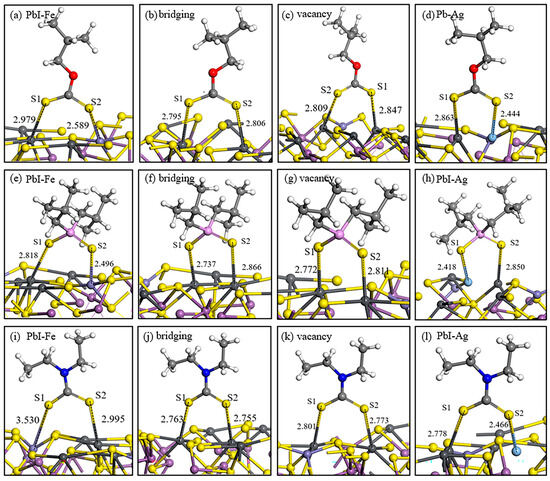 Adsorption structures of reagents on jamesonite surface. Butyl xanthate (a–d), 3418A (e–h), and DDTC (i–l).