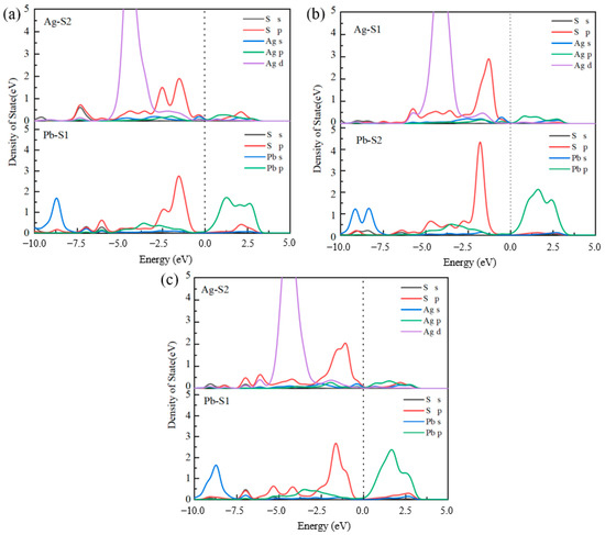 The substitution of Ag at 3-coordinate Sb sites exhibits the lowest formation energy (0.83 eV), making it the most feasible substitution pathway among all potential modes. However, the thermodynamic analysis reveals that Ag substitution in jamesonite remains energetically unfavorable, indicating a low likelihood of Ag existing in substitutional configurations. Following the substitution of Sb atoms, the crystal parameters of jamesonite were a = 15.925 Å, b = 19.404 Å, and c = 7.951 Å, slightly larger compared to the pure jamesonite crystal, but the deformation degree is smaller when Ag substitutes the 3-coordinate Sb atoms, indicating the most stable and easily occurring crystal deformation when Ag substitutes the 3-coordinate Sb atoms in jamesonite. The crystal structure of jamesonite will change at this point, as shown in Figure 1. Internal atomic distortions suggest that when Ag substitutes Sb atoms, the interaction between Ag and S atoms strengthens, leading to a reduction in bond lengths such as Sb–S1 from 2.705 Å to Ag–S1 at 2.459 Å; Sb–S2 from 2.551 Å to Ag–S2 at 2.454 Å; and Sb–S3 from 2.489 Å to Ag–S3 at 2.516 Å. With Sb’s atomic radius at 1.41 Å and Ag’s at 1.44 Å, it can be observed that Ag shows strong interactions with S, causing noticeable contractions in the Ag–S1 and Ag–S2 bond lengths, with an overall trend of contraction despite the increase in the Ag–S3 bond length.