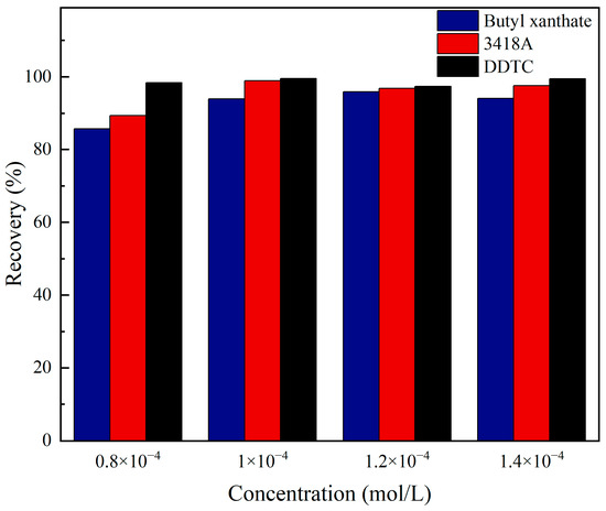 The effects of different types of collectors on the flotation of jamesonite were studied through micro-flotation experiments. The micro-flotation experiment results are shown in Figure 7. It is evident from the figure that as the dosage of the three collectors increases to 1 × 10−4 mol/L, the recovery of jamesonite stabilizes at over 90%. Specifically, the recovery of jamesonite is 94.09% when butyl xanthate is used as the collector, 97.6% when 3418A is used as the collector, and 99.48% when DDTC is used as the collector. Under different dosages of collectors, DDTC consistently exhibits the strongest collecting performance, while butyl xanthate shows the weakest performance. Therefore, the recovery of the three collectors is in the following order: DDTC > 3418A > butyl xanthate, which is consistent with the simulated interaction results of the collectors on the surface of jamesonite.