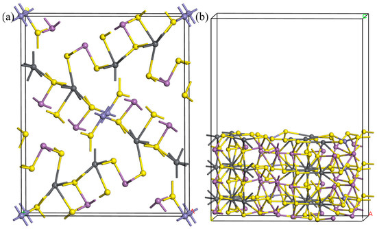 From the unit cell of jamesonite, it can be seen that the atoms in the crystal conform to the closest packing principle [28,29]. However, due to significant differences in atomic radii, they exhibit a branched distribution when connected at the microstructure level. According to the performance characteristics of the microstructure, this article categorizes the vacancy doping of jamesonite unit cells into two types: S–pb vacancy doping and S–Sb vacancy doping, as shown in Figure 2, where Figure 2a represents S–pb vacancy doping and Figure 2b represents S–Sb vacancy doping.
