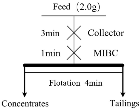 A micro-flotation experiment [36,37,38,39,40,41,42] used jamesonite from Dachang in Guangxi as the research subject. Under pH = 7 conditions, the study explored the effect of the dosage of three different collectors on the recovery of Ag-containing jamesonite. The research was conducted using an XFGCII.5 laboratory inflatable hanging groove flotation machine for the pure mineral flotation experiment. The experimental procedure is illustrated in Figure 9, and the results are shown in Figure 2.