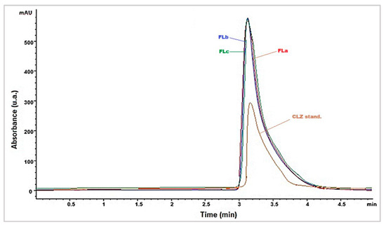 CLZ was quantitatively determined using an HPLC method. The chromatograms of CLZ pure substance (25 w/w %) and CLZ from the formulations (Fla, FLb, FLc 50 w/w %) are given in Figure 1. The detection of CLZ was performed at its characteristic wavelength of 280 nm (Figure 1).