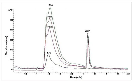 HPLC chromatograms of the LIG and CLZ and three formulations (Fla, FLb, FLc).