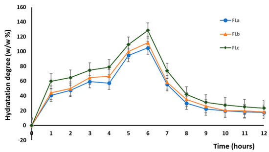Thus, Fla, FLb, and FLc formulations with 30 w/w % KOL, 5 w/w % CHT, and 11–13 w/w % LIG concentration exhibited absorbent properties in the first six hours of the test; after that, in the following 2–3 h, there was a slight decrease in mass. After 10 h, the matrix tablets were almost unchanged in size and mass (Figure 3). It is worth mentioning that formulation FLc with 30 w/w % KOL, 5 w/w % CHT, and 13 w/w % LIG showed superior hydration properties to other combinations. Formulations Fla and FLb, with 30 w/w % KOL, 5 w/w % CHT, and 11–12 w/w % LIG, were characterized by inferior adsorbent properties.