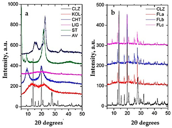 X-ray diffractograms of (a) pure components and (b) the comparison between CLZ and the formulations.