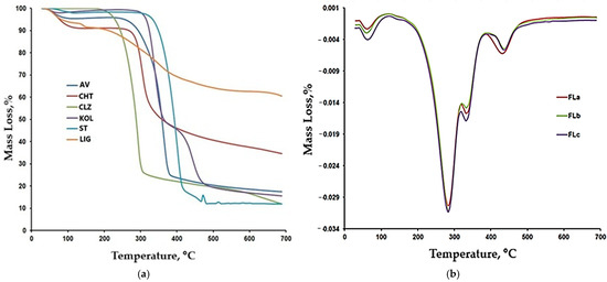 Figure 6a,b present a comparative representation of the TG curves for LIG, CLZ, CHT, AV, KOL, ST, and the formulations (Fla, FLb, and FLc). Based on the recorded TG, DTG, and DTA curves and their interpretation using the STAR software 19 from Mettler Toledo, the main thermogravimetric characteristics were obtained, as presented in Table 4.
