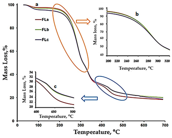 TG curves for the FLa, FLb, and FLc formulations: (a) (changes in the range 50–7000 °C), (b) (changes in the range 200–350 °C), (c) (changes in the range 400–700 °C).