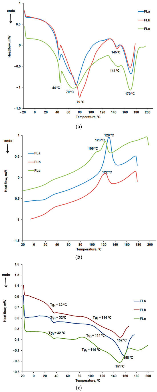 Figure 9a–c present the DSC curves comparatively obtained for the FLa, FLb, and FLc formulations.