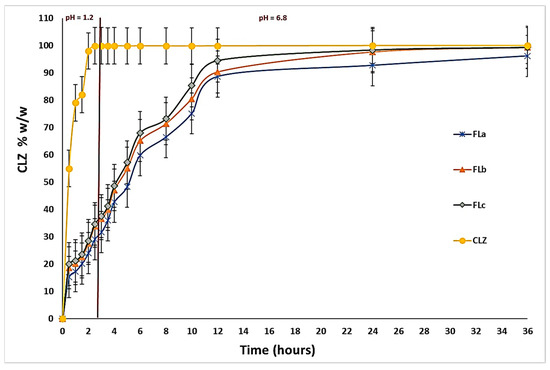 The in vitro dissolution test proved that the CLZ tablets were suitable for the prolonged and controlled release of CLZ. The released amount of CLZ varied with the percentage of LIG for all studied formulations. The FLc containing 13 (w/w) % LIG, 30 (w/w) % KOL, and 5 (w/w) % CHT released 28.42 (w/w) % of CLZ during the first two hours of the dissolution test in simulated gastric fluid, 94.50 (w/w) % CLZ of the 12 h and 99.30 (w/w) % at the end of the 36 h of testing. The FLa formulation containing 11 (w/w) % LIG released 96.17 (w/w) % of CLZ and FLb formulations containing 12 (w/w) % LIG released 98.75 (w/w) % CLZ at the end of the dissolution test.