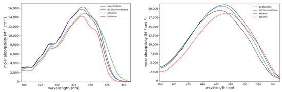 Absorption spectra of 6 (left) and 8 (right) in various solvents.