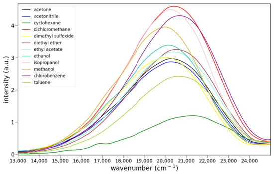 The calculations suggest that the solvent stabilization of the excited singlet state contributes to the increase in the fluorescence quantum yield. However, it cannot be the only factor. If it were, then the increase in quantum yield should correlate more strongly with a polarity parameter and not a H-bond donating ability parameter (SA). Returning to Table 1, the best correlation for the fluorescence intensity is achieved with a combination of SA with ET(30). In fact, the latter parameter is not a purely polarity scale. It has a H-bonding component, as shown by the differing values for acetonitrile (45.6) vs. methanol (55.4). Of the two parameters, the correlation is stronger with the SA parameter, given the better p-value and greater contribution to the fit (vide supra). A multilinear regression analysis of the ῦcog values using Equation (8) is shown in Table 5. In contrast to the previous regression analysis, the correlations are not as strong. The correlation with ET(30) or SA gives the best F-values. Surprisingly, combining parameters gives worse F-values. However, combining two polarity parameters, SdP and ET(30), is slightly better than combining ET(30) with SA.