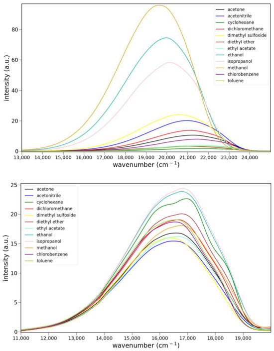 Fluorescence spectra of 7.9 × 10−5 M 5 (top), 9.6 × 10−6 M 6 (middle) and 1.0 × 10−5 M 8 (bottom) in various solvents: cyclohexane, toluene, chlorobenzene, methylene chloride, ethyl acetate, diethyl ether, acetone, acetonitrile, dimethyl sulfoxide, isopropanol, ethanol and methanol. Excitation was at 365 nm for 5 and 6 and 455 nm for 8.