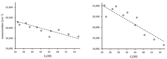 Plots of the emission maxima (cm−1) vs. ET(30) for 5 (left) and 6 (right) and lines of best fit, slopes, R2: −38, 0.77; −75, 0.82. Solvents are toluene, chlorobenzene, dichloromethane, ethyl acetate, diethyl ether, acetone, acetonitrile, dimethyl sulfoxide, isopropanol, ethanol and methanol.