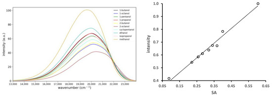 Fluorescence spectra of 1.9 × 10−5 M 6 in various protic solvents (left). Solvents are 1-butanol, 1-octanol, 1-pentanol, 1-propanol, 2-butanol, 2-octanol, cyclopentanol, ethanol, isopropanol and methanol. Plot of relative integrated fluorescence intensity vs. the SA solvent parameter and the line of best fit (right). Slope, R2: 1.15, 0.98.