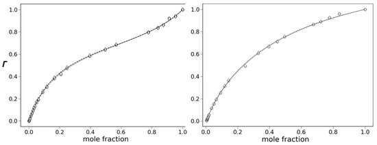 The preferential solvation can be analyzed through Equation (7) using the constants in Equations (2) and (3). The constant r is defined as (Φ0 − Φ1)/(Φ0 − Φ2) for Γ1 and (Φ0 × ῦcog0 − Φ1 × ῦcog1)/(Φ0 × ῦcog0 − Φ2 × ῦcog2) for Γ2. This constant represents the fractional change for singly H-bonded species. The values for f1/0, f2/0 and r are established through non-linear least-squares fitting of the plot of Γ vs. mole fraction and are shown in Table 2. The dashed lines in Figure 8 are the best-fit curves using the determined values.