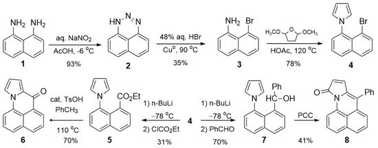Compound 6 is prepared in five steps from 1,8-diaminonaphthalene 1 (Scheme 1). This compound was prepared previously in seven steps from 1-aminonaphthalene as part of a study making analogs of Mitomycin C, an antitumor chemotherapeutic agent [6]. Diazotization of the diamine 1 gives the triazine 2, which reacts with HBr and activated Cuo to give bromonaphthyl amine 3 [7,8,9]. Variable amounts of naphthyl amine accompany this substitution reaction. This impurity is easily removed by recrystallization from ethanol. The pyrrole was constructed via Clauson–Kaas synthesis, providing the bromopyrrolylnaphthalene 4 as the gateway to all downstream derivatives. In all but one case, further elaboration is via the aryl lithium, resulting from lithium–halogen exchange with n-BuLi. Because the pyrrole group blocks the aryl carbanion, H-atom abstraction is greatly favored over nucleophilic addition. Only electrophiles without acidic hydrogens would avoid H-atom abstraction, and many of these reactants still gave poor yields or mixtures of products.