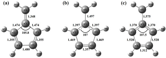 The equilibrium in Figure 1a shows an exocyclic bond with a single-bond–double-bond alternation. For the equilibrium (b), however, the alternation is reversed and reveals a biradical character [126]. As shown in Figure 1c, the conical intersection (CI) geometry closely resembles that of the minimum. However, a detailed examination of their internal coordinates reveals that the minimum lies between the minimum and the CI. This suggests that rapid nonadiabatic decay is likely to occur following the initial vibrational relaxation to the minimum. This conclusion is supported by the fact that all bond distances at the S1 minimum fall between their corresponding values at the minimum and the CI. Specifically, from the minimum to the minimum and further to the CI, the C1–C6, C2–C4, and C3–C5 bond distances increase monotonically, while the C1–C2 and C1–C3 bond distances decrease monotonically. Additionally, the C2–C1–C3 angle is smaller at the equilibrium geometry but larger near the CI. Therefore, the wavepacket motion from the Franck–Condon (FC) region to the minimum and further toward the CI region involves the extension of the C2–C4 and C3–C5 bonds, the contraction of the C1–C2 and C1–C3 bonds, and a decrease in the C2–C1–C3 angle (see Figure 1). These findings are consistent with previous studies [126].