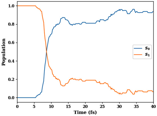 To set up the stage, we begin with the populations of the and states of fulvene, which are shown in Figure 2. These populations correlate with those obtained by the numerically accurate AIMS method [118,119,120,121] as well as with those computed by the SQC/MMST method [121]. No decay of the population occurs within the first 5 fs, during which the wavepacket travels from the Franck–Condon to the CI region. Then, the population decreases rapidly, reaching half of its initial value at 9 fs and less than within 10–15 fs. After that, a weak-amplitude population recurrence occurs within 15–25 fs. This flat recurrence is caused by the torsional motions, which bring the wavepacket back to the PES crossing each 20–25 fs. After the recurrence, the population remains small, but its quenching slows down considerably.