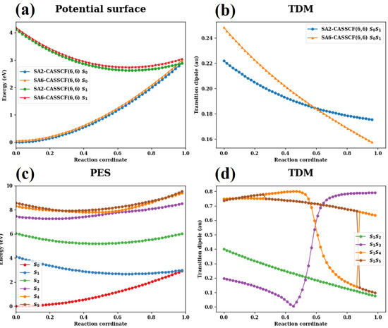 (a) Linear interpolated PESs of and between minimum and CI obtained at SA2-CASSCF(6,6)/6-31G(d) and SA6-CASSCF(6,6)/6-31G(d) levels. (b) Linear interpolated TDMs from to between minimum and CI obtained at SA2-CASSCF(6,6)/6-31G(d) and SA6-CASSCF(6,6)/6-31G(d) levels. (c) Linear interpolated PESs from to between minimum and CI. (d) Linear interpolated TDMs from to between minimum and CI.