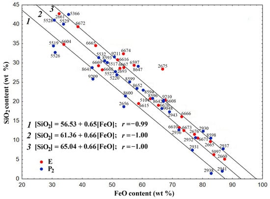 The values of the correlation coefficients indicate a strong correlation between the values of oxide contents for the regression Equations (1)–(3). The composition of the overwhelming majority of globules of both series corresponds to the second and third equations.