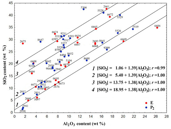 Dependence of the SiO2 content on the Al2O3 content for the skeletal-dendritic FSs of series P2 and E.