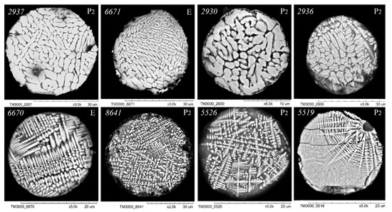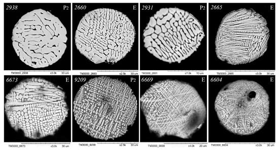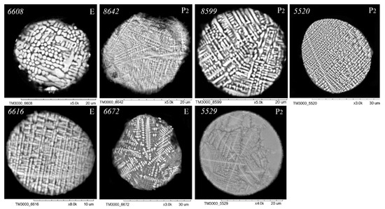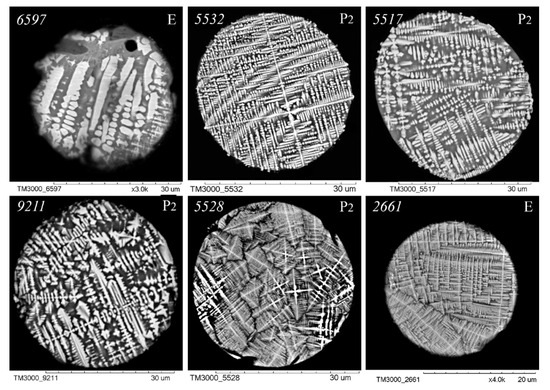 As illustrated in Figure 3, Figure 4, Figure 5 and Figure 6, scanning electron microscopy (SEM) images of polished sections of globules reveal a monotonic increase in the content of SiO2 and Al2O3, and a decrease in the content of FeO, concomitant with changes in their structure. The globule number is indicated in the left corner of all SEM images, and in the right corner, whether they belong to the fraction of the P2 or E series is indicated.