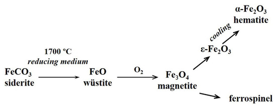 Subsequent oxidation of melted droplets in areas with high oxygen content and crystallization at lower temperatures determines the phase composition of the resulting FSs. The value of melt viscosity with a decrease in the iron content from 70 to 35 wt% in the FeO—Al2O3—SiO2 system increases more than 20-fold at 1200 °C [68]. This complicates the crystallization of high-viscosity melts on cooling and is the reason for the high content of glass phase in FSs with a low iron content. During cooling, the melts recrystallize, which is influenced by the viscosity of the melts, the nature of the phases in equilibrium with that melt, and a change in the oxidation potential. The oxidation of Fe2+ to Fe3+ is a result of the oxidation potential change. The thermochemical transformation of siderite in the carbon matrix follows the scheme shown in Figure 7.