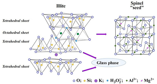 Illite is a crystalline mineral with a layered structure, and the basic crystalline unit of illite consists of two tetrahedral sheets and one octahedral sheet. The tetrahedral sheets consist of silicon atoms located in the cavities of the tetrahedra of oxygen atoms, while aluminum, magnesium or iron cations coordinated with hydroxyl groups are located in the cavities of the octahedra of oxygen atoms. At high temperatures, the octahedral sheets are transformed into spinel nuclei. The tetrahedral sheets are the basis of the glass phase (Figure 8).