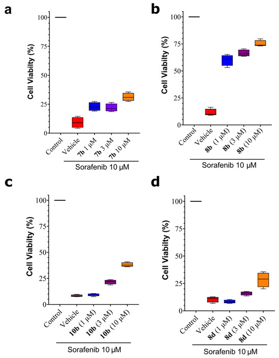 Cell viability of HRMCs treated with sorafenib was determined with a water-soluble tetrazolium salt (WST) assay (Table 1). Sorafenib exposure resulted in around 90% of the cell dying (Figure 3). Sorafenib has been reported as a potent sEH inhibitor [46]; however, it does not protect the cells because mesangial cells do not produce sufficient EETs, thus, providing a good background to test EET analogs. Analogs containing the urea isostere (Entries 1–6) were inactive, except for 7b (Entry 3, Table 1 and Figure 3a), which exhibited significant activity even at low concentrations (1 µM). No explanation for why 7b was active and none of the structural homologs (e.g., 7a, Entry 2) were inactive could be found. The oxamide-containing analogs (Entries 7–11), however, all exhibited significant activity. Out of all the analogs tested, the saturated analog 8b demonstrated superior efficacy and good potency, with an increase in cell viability of 64% at 10 µM and 50% at 1 µM (Entry 8, Table 1 and Figure 3b). Saturated analogs with the first nitrogen in 7-position (Entries 7–8), counting from the carboxylic acid, exhibited an increase in potency over their counterparts with the nitrogen in 8-position (Entries 9–10, Table 1 and Figure 3d). The effect of carbon chain length towards the omega end proved substantial for 8a–b, with the C11-chain being superior. For 8c–d, however, chain length towards the omega end made no significant difference. Interestingly, introduction of the Z-alkene in 8e (Entry 11) resulted in diminished activity (cf. Entry 8) to the point of near insignificance. Analogs containing amide isosteres (Entries 12–19) exhibited activities ranging from good to none. Those compounds that had the amide group in 8,9-position relative to the carboxylic acid (Entries 14–17, Table 1 and Figure 3c) all showed activity at 10 µM, although none at 1 µM. Shifting of the amide group position to either 7,8-position (Entries 12–13) or 9,10-position (Entries 18–19) caused activity to drop to zero. The preference for 8,9-position observed here is not entirely surprising, as it mirrors that of an endogenous substrate (8,9-EET), at least on paper. Interestingly, it is worth noting that the distance between what is thought to be the primary pharmacophores, the carboxylic acid and oxamide, can be varied by one carbon atom (Entries 7–8 vs. 9–10) without greatly impacting activity. This phenomenon might be the result of the oxamide group consisting of two amides, which can interact with the target, rather molecular flexibility in the putative receptor.