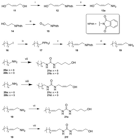 Reagents and conditions: (i) Phthalimide, PPh3, diisopropyl azodicarboxylate, rt, 16 h; (ii) N2H4·H2O, EtOH, reflux, 2 h; (iii) DMP, NaHCO3, CH2Cl2, rt, 18 h; (iv) PPh3, MeCN, reflux, 18 h; (v) Sodium bis(trimethylsilyl)amide (NaHMDS), THF, hexamethylphosphoramide, 15, −78 °C, 18 h; (vi) N2H4·H2O, EtOH, reflux, 2 h; (vii) CDI, MeCN, 0 °C → rt, 30 min, then 4-aminobutan-1-ol (13b), rt, 30 min; (viii) CDI, MeCN, 0 °C → rt, 30 min, then 13a, rt, 30 min.