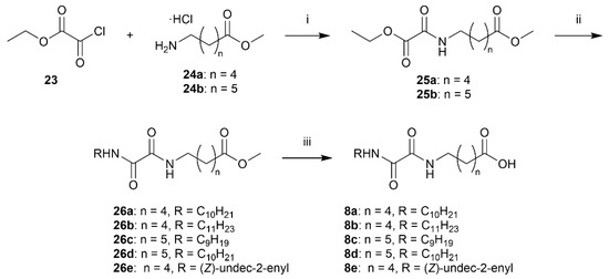 To produce oxamide analogs 8a–e, a three-step procedure involving a selective condensation between an amine and the 2-oxamido substituted ester 25a–b was envisaged (Scheme 3). In the first step, ethyl oxalyl chloride (23) was reacted with the hydrochloride salts of amino esters in the presence of the base triethylamine 24a–b. Sufficient purity of the resulting intermediates 25a–b could usually be achieved by merely washing the DCM with dilute aqueous acid. Next, the aliphatic amines (n-nonylamine, n-decylamine, n-undecylamine or 19) reacted selectively [41,42] with the 2-oxamido substituted ester (25a or 25b) over the aliphatic ester, giving oxamides 26a–e. After hydrolysis, the oxamide analogs 8a–e were obtained.