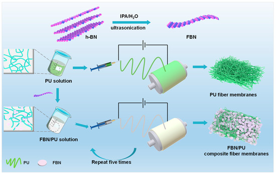 Schematic of the preparation of FBN, PU composite fiber membrane, and FBN/PU composite fiber membrane.