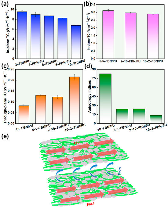 In-plane TC of single-layer FBN/PU composite fiber membrane and PU composite fiber membrane (a) and multi-layer FBN/PU composite fiber membrane (b). Through-plane TC of FBN/PU composite fiber membrane (c). Anisotropy indices (d) of FBN/PU composite fiber membrane. (e) Thermal conductivity mechanism of FBN/PU composite fiber membranes.