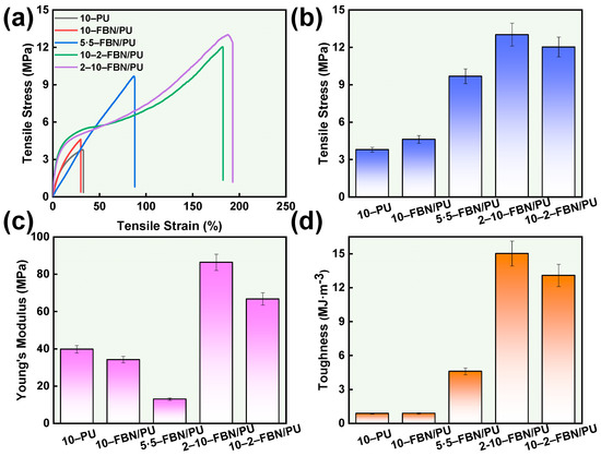 (a) Stress–strain curves, (b) tensile stress, (c) Young’s modulus, and (d) toughness of FBN/PU composite fiber membrane.