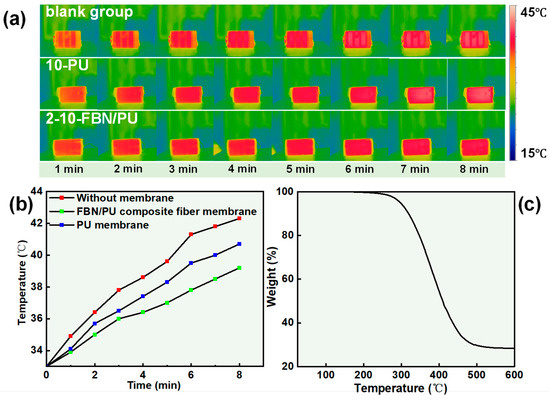 The thermal stability of composite films in high-temperature environments is critical for their practical applications. To test the thermal stability of the FBN/PU composite fiber membranes, TGA tests were performed on the 2-10-FBN/PU composite fiber membranes. As shown in Figure 5c, the 2-10-FBN/PU composite fiber membrane started to undergo thermal decomposition at 300 °C, which was attributed to the decomposition of the PU polymer. When the temperature exceeded 460 °C, the weight remained stable with increasing temperature, and the residual mass was 28%, which was attributed to the incorporation of FBN and resulted in a residual mass at equilibrium proportional to the amount of FBN. Thus, the thermal study clearly shows that the incorporation of FBN significantly increases the thermal stability of the FBN/PU composite fiber membrane. The prepared FBN/PU composite fiber membrane has good thermal stability and can be adapted to thermal management work in higher-temperature environments.