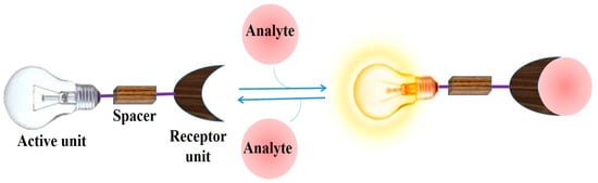 Heavy and transition metal (HTM) ions are critical to biological systems but pose significant threats to the physical environment as pollutants. Therefore, precise detection and quantification of trace-level contamination are essential for safe environmental and biological health [1,2]. The molecular recognition sensing of metal ions is one of the most vibrant and fascinating fields of research in analytical chemistry due to its major impact on industrial sector processes [3], environmental science [4], catalysis [5], medicine, biological and human sciences [6]. Molecular sensors, which are optical probes based on organic molecules, are essential for identifying and detecting detrimental metal ions in biological, food, water, and air environments [7]. A molecule must have a chromophore unit and appropriate active binding sites in order to function as a robust and efficient optical sensor [8]. The development in innovations of novel efficient chromofluorescent chemosensors for detecting toxic metal ions with high selectivity and sensitivity is currently an important field of research for many scientists [9]. The term “chemosensor” refers to “devices that bind selectively and reversibly to the active site of analyte with concomitant change in one or more properties of the system, such as fluorescence, color, or redox potential” [10,11]. As Figure 1 shows, a chemosensor typically consists of three parts: (1) a “receptor” or binding unit, (2) a “signaling unit” that alters its photophysical properties upon interacting with the analyte, and (3) a “spacer” that moifies the electronic interaction between the receptor and signaling unit.