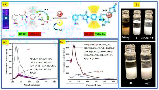 The receptor 26 exhibited a remarkable sensitivity and selectivity for the Ag+ ion employing a 1:1 complex stoichiometry. This was confirmed by fluorometric titrations, Job’s plot variation, Benesi–Hildebrand calculation, 1H-NMR, FT-IR, ICT mechanism, and DFT analyses [113]. The interaction between receptor 26 and Ag+ ions is distinguished by two binding phenomena: Internal Charge Transfer (ICT) and chelation-enhanced fluorescence (CHEF). Initially, receptor 26 has modest fluorescence due to free rotation of the C–N bond. Upon Ag+ binding, a 13 nm hypsochromic shift occurs, limiting ICT and increasing emission intensity via CHEF (Figure 3A).