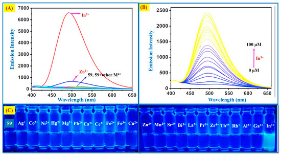 Probe 59 demonstrates preferential binding with In3+, and the complex reveals strong fluorescence intensity. This could possibly be the result of the simultaneous involvement of crucial aspects that need to be taken into account. For example, a process known as intramolecular charge transfer (ICT) may be responsible for the sharp rise in emission intensity, independent of red shift [170]. Probe 59 is dimly fluorescent because it has > C=N–, which promotes > C=N rotation [171]. Rotation is prohibited, and fluorescence characteristics are boosted upon interaction with In3+ ions. The coordination complex forms an extremely rigid structure that hinders nonradioactive decay. It is the source of the chelation-enhanced fluorescence effect (CHEF) [172]. Figure 6A illustrates that, after excitation at 337 nm, the emission peak 59 occurs at 500 nm. Fluorescence abruptly increased by 60 times when In3+ (10 eq.) was added. Furthermore, when Al3+ and Ga3+ were analyzed with the other tested ions, no appreciable variation in emission intensity was observed. These results suggest that In3+ ions may be detected using colorimetric and fluorescence characteristics. A spectral titration was used to investigate the linear connection between concentrations and intensity in order to assess probe sensitivity (Figure 6B). The spectral titration of 59 (50 μM) with In3+ was carried out by gradually adding 0–60 μM in DMSO: H2O (2:8, v/v) medium. When In3+ is added to a solution containing 59, a new emission band appears at about 500 nm, and the fluorescence intensity changes when excited at 337 nm. The performance of L (50 μM) in DMSO: H2O (2:8, v/v) is shown, when reacted with 10 equivalents of different metal ions such as Ag+, Rb+, Ca2+, Mg2+, Co2+, Ni2+, Mn2+, Hg2+, Pb2+, Cd2+, Zn2+, Cu2+, Ba2+, Sr2+, Fe3+, Al3+, Ga3+, In3+, La3+, Ce3+, Pr3+, Bi3+, Zr4+, and Th4+, (Figure 6C). Under normal conditions, the color of the solution in any glass vial does not change; nevertheless, when exposed to UV light, only the vial containing 59 with In3+ ions show luminous activity, whilst the others do not. This shows that 59 is selective for In3+ ions. Furthermore, its absorption and emission spectrum responses were thoroughly investigated. Sensor 59 may be used to detect In3+ ions in environmental samples, as evidenced by the detection of In3+ in water samples. Interestingly, the bio-imaging showed that 59 was able to identify In3+ ions in zebrafish larvae and DrG cells.