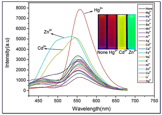 As H2O-THF solution (which contains 90% H2O) demonstrated the highest fluorescence emission, this solution system was selected as the aqueous medium to examine chemosensor 64’s sensing capacity for various metal ions. Figure 7 displayed the sensing fluorescence spectra. The addition of the metal ions Mg2+, Pd2+, Co2+, Ba2+, Mn2+, Pb2+, Al3+, Ag+, Ca2+, Fe3+, Na+, K+, Ni2+, Cu2+, and Li+ was seen to cause no discernible change in the fluorescence wavelength and a narrow range of emission intensities. However, a notable alteration in the fluorescence emission was noted upon the addition of Zn2+, Cd2+, or Hg2+. The fluorescence rose significantly with the addition of Hg2+, while the maximum emission wavelength remained at around 550–580 nm. When Zn2+ was added, the fluorescence emission significantly increased and the highest emission wavelength shifted from 550–580 nm to 500–550 nm. Additionally, the solution’s color changed from red to green. The fluorescence showed a shift from 550–580 nm to 500–580 nm with a noticeable increase in emission strength and a color change from red to yellow upon the addition of Cd2+ Bis-TPE 64 showing strong selective sensitivity to Zn2+, Cd2+, and Hg2+, respectively, as demonstrated by these data.