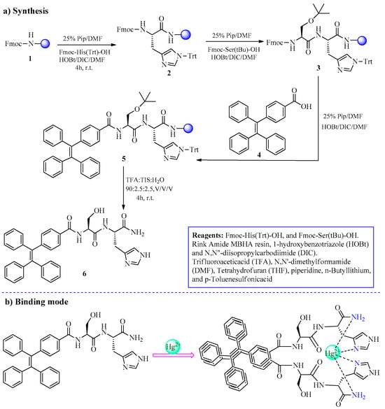 Of all the HTM ions, mercury ions are among the most dangerous for the environment and human health. As a result, numerous kinds of fluorescent chemosensors for Hg2+ ions detection have been synthesized as fluorescence offers an accurate and effective analysis method [1,2,77,78]. Moreover, the need for a turn-on response to Hg2+ was great since a turn-off response would have been confused with a false signal caused by Hg2+ quenching, chemosensor precipitation, or impurity absorbance. Thus, there is a need to create fluorescent chemosensors that will trigger a reaction in response to detecting Hg2+ ions in aqueous solutions in a selective and sensitive manner [79,80,81,82,83,84,85,86,87,88,89,90,91,92]. A chemosensor based on the metal ions’ peptide receptor was developed by using an aggregation-induced emission fluorospore. It enables the detection of heavy metal ions in cell analysis and aqueous solution. The peptidyl chemosensor with tetraphenylethylene fluorophore demonstrated a completely selective turn-on response to Hg2+ among 16 metal ions in an aqueous buffered solution including NaCl. When Hg2+ ions were linked by the peptidyl chemosensor and subsequently collected in an aqueous buffered solution, the emissions at around 470 nm revealed a noticeable rise (OFF-ON). The fluorescent sensor responded to Hg2+ with excellent sensitivity since about 1.0 equivalent of Hg2+ was required for the shift in emission intensity to be saturated. Hg2+ ion detection limit of 5 was smaller than the EPA’s highest amount of Hg2+ permissible in drinking water. Furthermore, the peptidyl chemosensor entered living cells and used the turn-on response to recognize intracellular ions Hg2+ [93]. High-purity TPE-based peptide chemosensors with a 69% yield were generated with flexibility in solid-phase synthesis employing Fmoc(Fluorenylmethyloxycarbonyl) chemistry [93]. Following deprotection, Fmoc−L−Ser(tBu)−OH was added, and TPE, HOBt, and DIPC were coupled in DMF for four hours at room temperature. There have been schemes of TPE fluorophore synthesis (Scheme 1) [94].