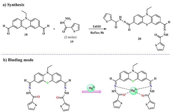 V. Govindasamy et al. synthesized chemosensor 20 for detection of Hg2+. Thiophene-2-carboxylic acid hydrazide 19 and 10-Ethyl-10H-phenothiazine-3,7-dicarbaldehyde 18 were reacted in ethanol, refluxed for 8 h. The target product 20 with a 92% yield was obtained (Scheme 4) [99].