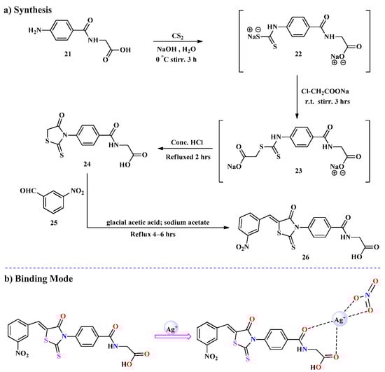Silver metal ions are captivating, expensive, and physiologically active heavy metal ions. Ag+ ions are found in both human and animal bodies and are fundamental to many medical procedures, including antibiotics, sterilization processes, anti-infective treatment, and antibacterial activity [33,100,101]. Silver serves as a catalyst in oxidation processes as well as in electrical and photographic imaging, accessories, and silverware production [102,103]. In addition, the Ag+ ions make significant contributions to environmental pollution because of the growing need for silver compounds in the increased industrial and commercial sectors [104,105]. Ag+ ions have been released into the atmosphere as a result of these actions, threatening both humans and aquatic life [106]. Overindulging in silver over an extended time period is ideal for precipitation and adverse effects on human health [107,108]. A potentially organic chemosensor was synthesized for widely used Ag+ ion identification and detection [109,110]. C. I. David with his coworkers described the synthesis and design of the fluorescence-based, rhodamine-derived chemosensor receptor 26, which was developed to detect Ag+ ions in DMSO-H2O solution mixture with excellent sensitivity and selectivity. Through the application of the chelate-enhanced fluorescence (CHEF) mechanism, the chemosensor 26 may selectively “turn on” fluorescence for Ag+ ions [111]. The synthesis procedure of rhodanine-3-hippuric acid involved simple steps. In a multi-step reaction with CS2, chloroacetic acid, and HCl, p-Amino hippuric acid 21 was changed into rhodanine-3-hippuric acid 24 as a result. The final receptor 26, with a 59% yield after recrystallization in ethanol, was then produced by the product’s reaction with m-nitrobenzaldehyde 25 in the presence of sodium acetate and glacial acetic acid. Scheme 5 illustrates the synthesis pathway of the receptor 26 [112].