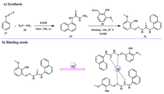 Y. Seo and S. Park with their collaborators designed a chemosensor 31. 1-naphthyl isothiocyanate 27 and hydrazine 28 in ethanol interacted to form a white powder 29. The product was reacted with O-Vanillin 30 producing intended product 31 (Scheme 6) [115]. Ag+ ion exhibited a selective fluorescence turn-on mechanism over the various metal ions in an efficient fluorescence naphthyl thiourea-based chemosensor 31. It was determined that the complexation ratio of 31 with Ag+ was 2:1. Ag+ ions could be detected at low detection limits (3.82 μM) using this organic sensor (31).