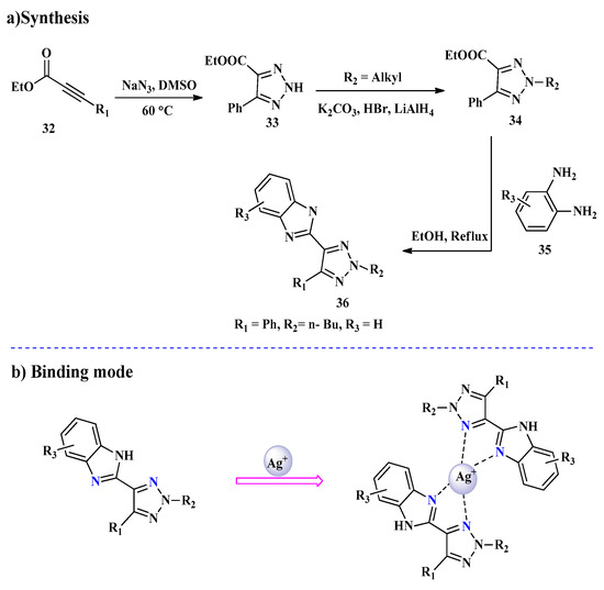 Q. Lai, Q. Liu and their coworkers successfully designed and synthesized triazole-imidazole ligands 36 as selective fluorescent probes for detecting Ag+ ions (Scheme 7). The chemosensor 36 exhibits noticeable fluorescence emission in both aqueous and organic solutions due to the presence of intramolecular hydrogen bonding. This chemosensor is specifically useful for the evaluation of Ag+ ions due to its quick reaction response times in aqueous medium. The ultrafast response time (less than 30 s) of this sensor 36 in aqueous conditions demonstrated the practical application of this novel cation probe and the significance of these triazole-based fluorescent compounds in chemical and material research [116].