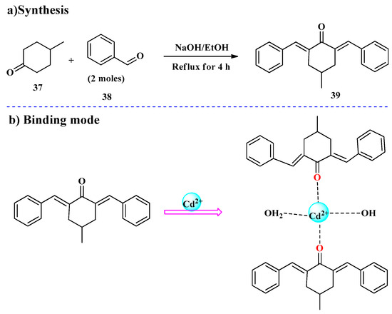 According to the periodic table, cadmium belongs to group 12 transition metal ions. Cadmium resembles mercury and zinc metals and has a silvery-half-white appearance [117]. Cadmium is the most hazardous of the numerous toxic heavy metal ions that are found naturally in the earth’s crust [118]. Excessive cadmium exposure can cause renal failure, a drop in calcium metabolism, and the development of certain malignancies. [119,120]. One of the most hazardous and carcinogenic heavy metal ions is cadmium (Cd2+). Cadmium ions are used extensively in the industrial production of metal alloys, electroplating films, battery cells, and nuclear reactor control rods [121,122]. One should not undervalue the detrimental effects of Cd2+ ion pollution. The Cd2+ ion can enter the body through polluted soil, water, air, and a variety of other sources with a biological half-life of 20–30 years. This may result in several kinds of illnesses affecting the kidney, liver, lungs, heart, or other body organs [123,124,125]. The increased Cd2+ concentration of the body even at extremely low levels can lead to a variety of illnesses, including potentially fatal conditions such as diabetes, cancer, and chondropathy [126,127]. To obtain the best possible sensitivity and selectivity for Cd2+ ion detection, several photophysical characteristics must be considered while designing the construction of a fluorescent chemosensor [128]. Sadia and her colleagues developed a novel chemosensor 2, 6-di((E)-benzylidene)-4-methylcyclohexan1-one) 39. Experimental findings demonstrated that 39 functions as an effective and selective chemosensor for Cd2+, even in the presence of other metal ions in the aqueous medium, comprising Hg2+, Cu2+, Mg2+, Ca2+, Al3+, Co2+, Ag+, Fe3+, Fe2+, Ni2+, Cr3+, Pb2+, Ba2+ and Zn2+. When the synthetic chemosensor 39 interacts with Cd2+, the fluorescence emission spectrum changes significantly. The fluorometric response verified the formation of the 39 complex with Cd2+. An ethanolic solution of 4-methyl cyclohexanone 37 and benzaldehyde 38 was combined with sodium hydroxide, and the mixture was refluxed for four hours at room temperature to generate the desired product 39 (Scheme 8) [129].