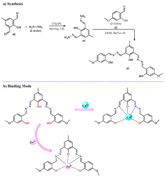 R. Purkait, S. Dey, and C. Sinha synthesized a chemosensor 43 for detecting Cd2+ and Zn2+ ions effectively. An important aromatic aldehyde (2,6-diformylphenol) was utilized to design compartmental Schiff base ligands. Salicylaldehyde and 2,6-diformylphenol were condensed with hydrazine to produce a hetero-imine derivative (a novel Schiff base) with noticeable fluorescent properties. As 2,6-diformylphenol includes fluorophore vanillin, its vanilinyl hydrazone is a highly potent fluorogenic probe. Four nitrogen atoms and three -OH groups act as binding sites in this novel chemosensor, 6,6′-((1E,1′E)-((2E,2’E)-((2-hydroxy-5-methyl-1,3 phenylene)bis(methanylylidene))bis(hydrazine-2,1-diylidene))bis(3-methoxyphenol). The synthesis procedure involved reacting 4-methyl-2,6-diformylphenol 40 with excess hydrazine in MeOH, and then condensing the resulting 2,6-bis((E)-hydrazonomethyl)-4-methylphenol 41 with 2-hydroxy-4-methoxybenzaldehyde 42 in dry EtOH. This produced 88% yield of the intended product 43 (Scheme 9) [119].